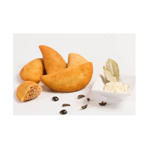 INGREDIENTES: Massa (47%): farinha de TRIGO, margarina vegetal, LEITE e sal Recheio (40%): carne de bovino (66%), farinha de TRIGO, SOJA, chouriço de colorau (entremeada e couratos de suino, água, sal, proteina de SOJA, massa de pimentão, açucares redutores E415i, especiarias naturais, pimentão oleoresina, E316 e E250). PÃO ralado, óleo vegetal, cebola, piripiri, colorau, tomate, salsa, sal, caldo de galinha (sal, fecula de milho, glutamato monossodico, açucar, gordura vegetal de palma, extracto de proteinas vegetais de SOJA, extracto de levedura, gordura de frango, carne de frango, aroma de frango, vegetas (cebola, alho e salsa), corantes naturais (E150d e E160c), especiarias), alho Cobertura (13%): encolante (farinha de TRIGO, sal, goma xantane (E415) e sorbato de potássio (E202), água e PÃO ralado.
