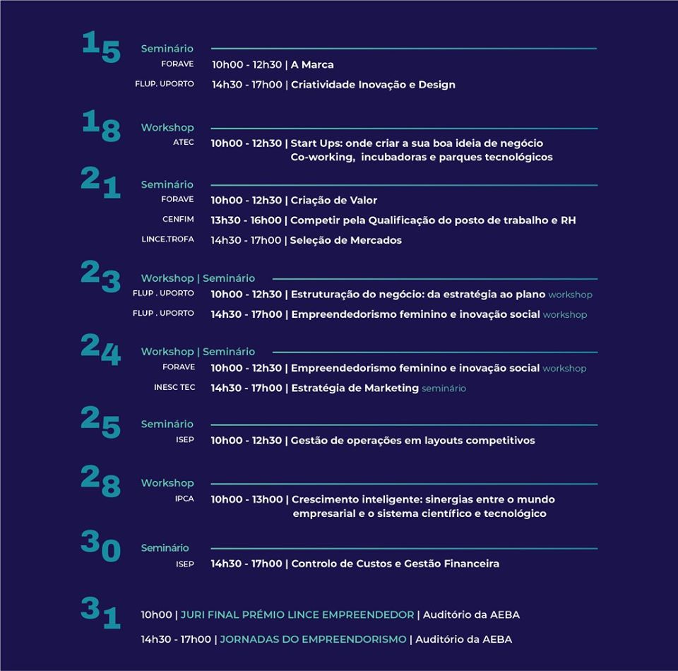Empreendorismo & Capacitação, é a grande assinatura do projeto Lince..Durante o mês de outubro, a AEBA, Associação Empresarial do Baixo Ave, com instituições parceiras, vão dinamizar um conjunto de workshops e seminários que abraçam esta temática. Inscreva-se, esperamos por si: